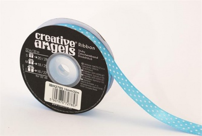 Szatén szalag, 15 mm x 22 m, világos kék fehér pöttyökkel