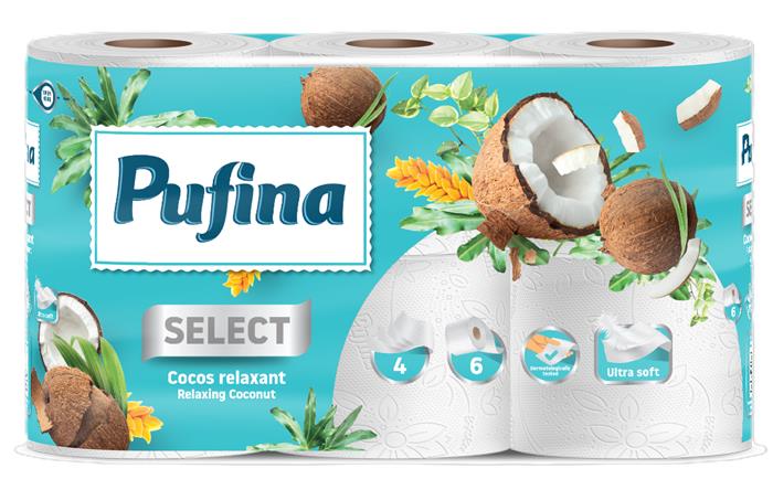 Toalettpapír, 4 rétegű, kistekercses, 6 tekercs, PUFINA "Relaxing Coconut", kókusz illattal