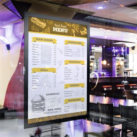 DURAFRAME® SUN, elektrosztatikusan tapadó infokeret adhézió segítségével, könnyedén, buborékmentesen rögzíthető az üvegfelülethez.
