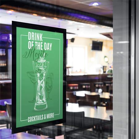 DURAFRAME® SUN, elektrosztatikusan tapadó infokeret adhézió segítségével, könnyedén, buborékmentesen rögzíthető az üvegfelülethez.