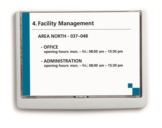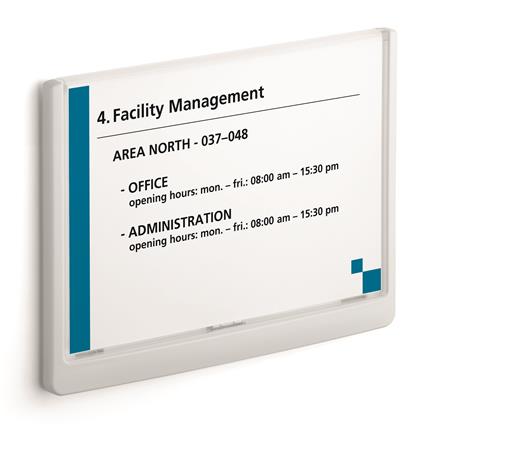 KezdőlapÜzemeltetésLétesítmény üzemeltetésInformációs és tájékoztató jelekInformációs tábla, 210x148,5 mm, DURABLE "CLICK SIGN", fehér
