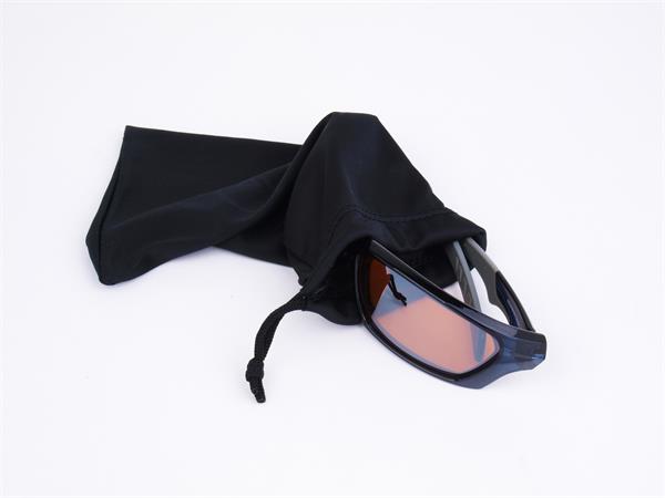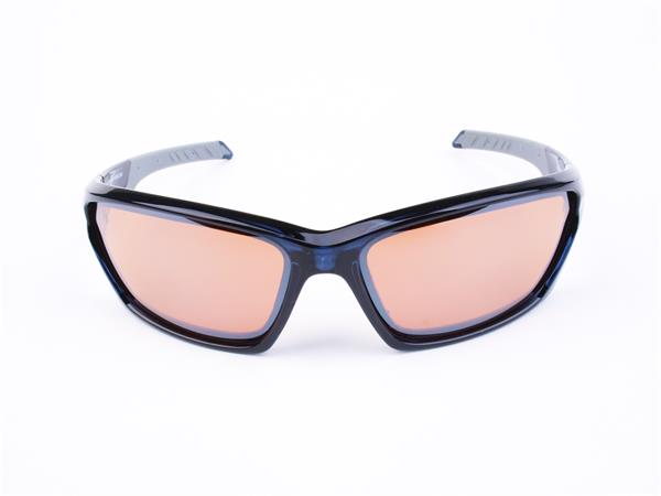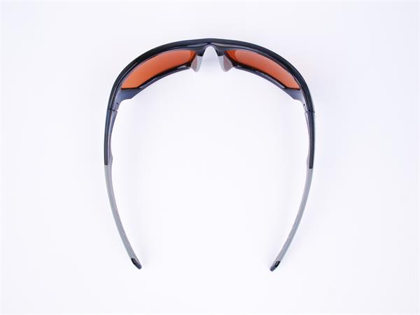 Sportnapszemüveg borostyánszínű HD lencsével, fekete műanyag kerettel.